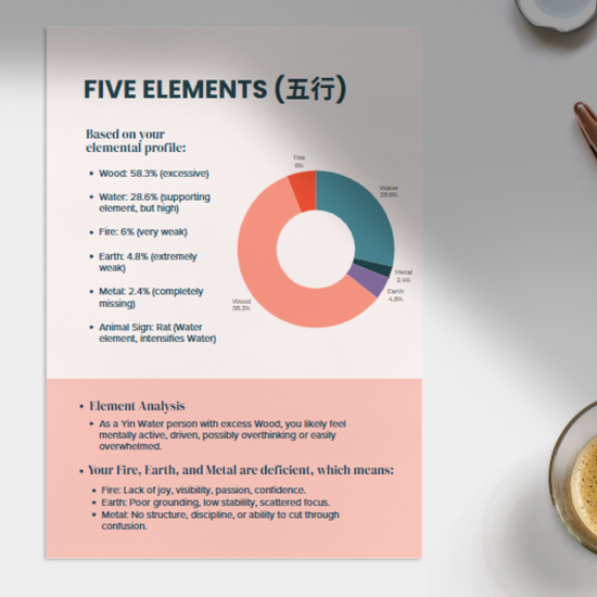 ✓ Your Elemental DNA – Understand your innate strengths and weaknesses based on the Five Elements (Wood, Fire, Earth, Metal, Water). Discover what truly drives you, what drains you, and how to restore energetic balance.