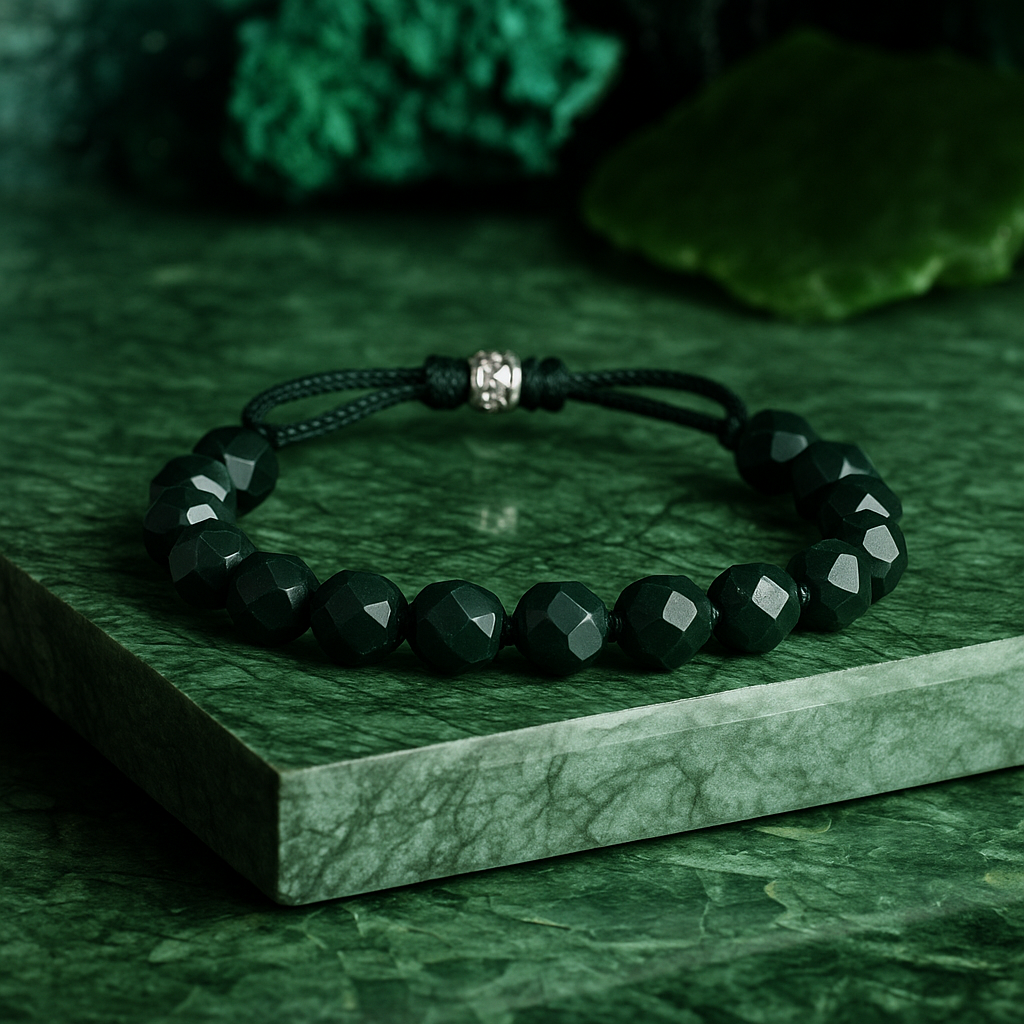 The Verdant Command – Stone of Earth & Flow is a grounding talisman within the Verdant Collection, designed to attract abundance through balance and movement. Its dark forest-green faceted stones reflect both discipline and adaptability—mirroring the strength of mountains and the flow of rivers. Ideal for leaders, builders, and quiet strategists, this bracelet fortifies your energy, helping you stand firm while embracing the current of opportunity.