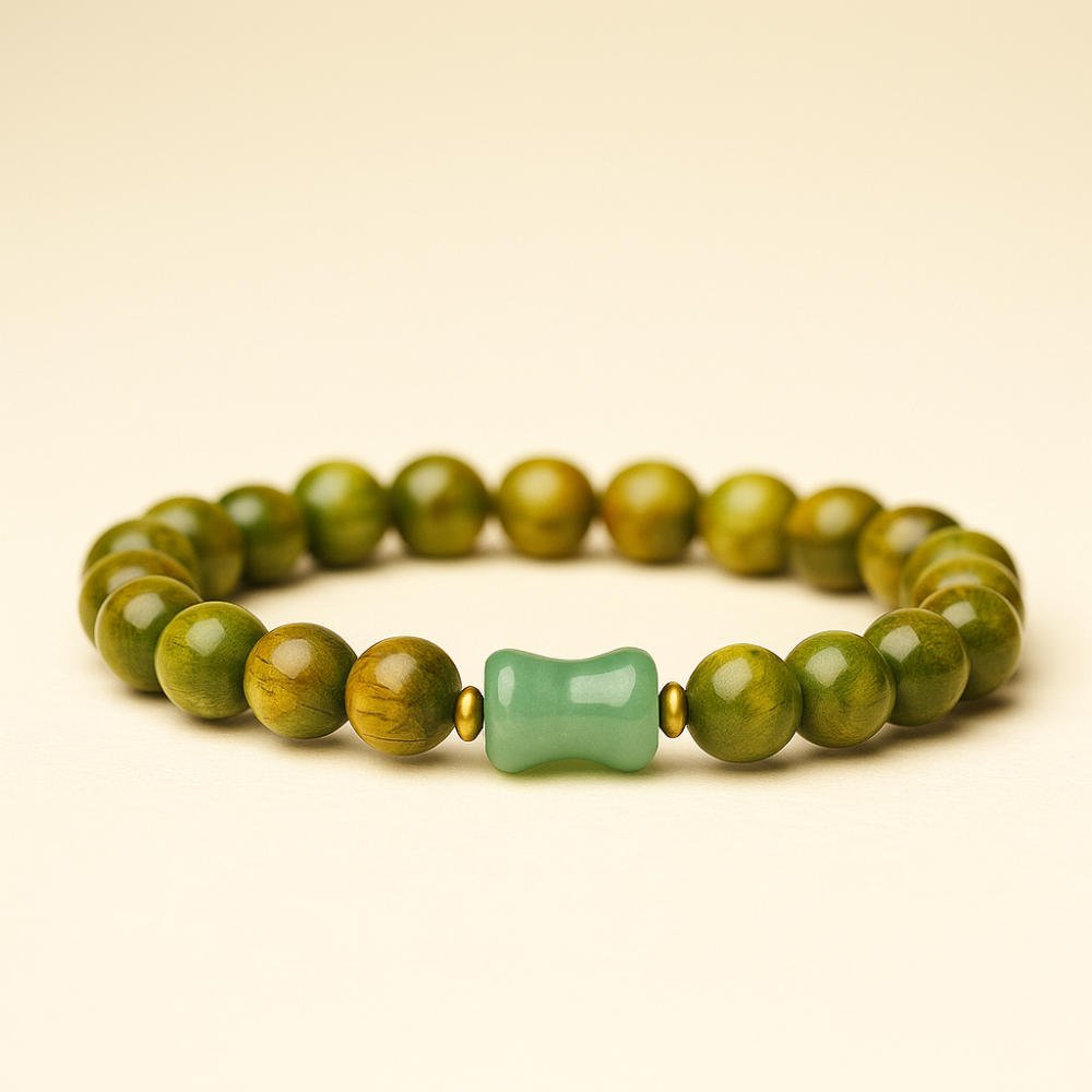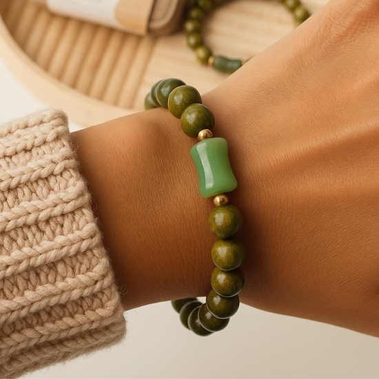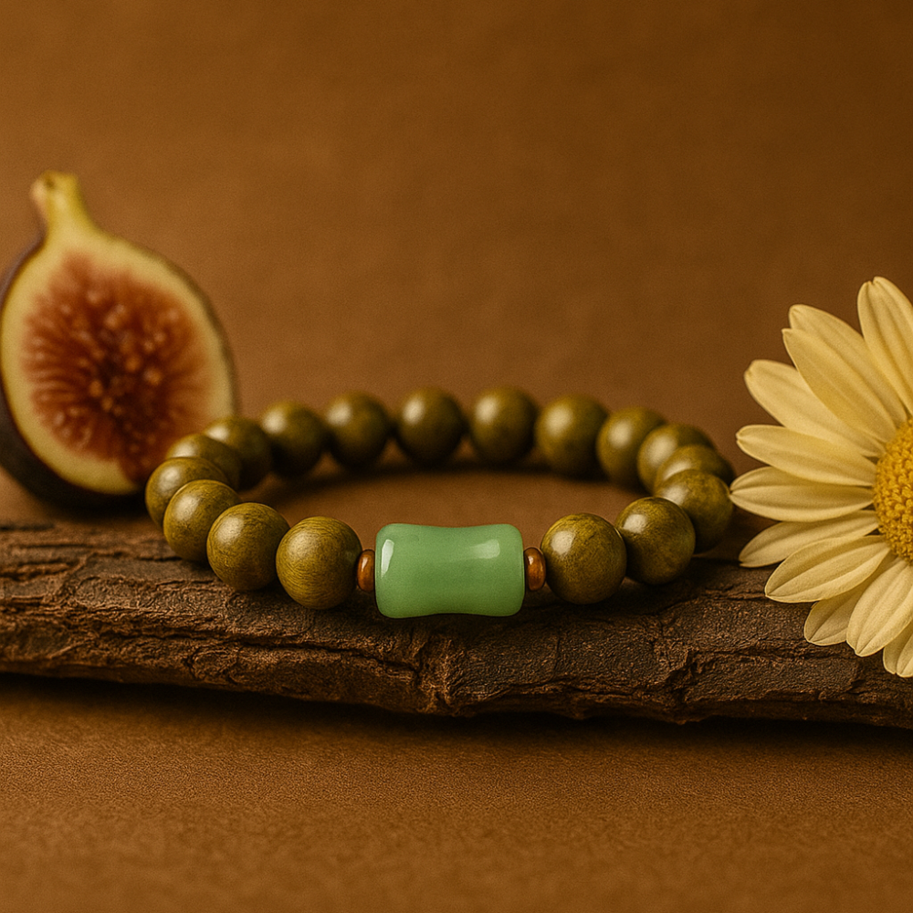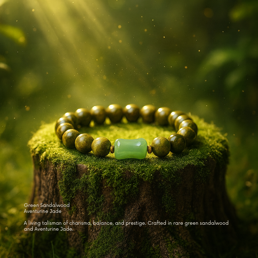 The Verdant Resonance Bracelet awakens this current. The green sandalwood grounds your energy, giving your presence a steady calm that commands respect without effort. The Aventurine centerpiece amplifies your inner balance, sending out subtle waves of magnetism that others cannot quite explain, but cannot ignore.